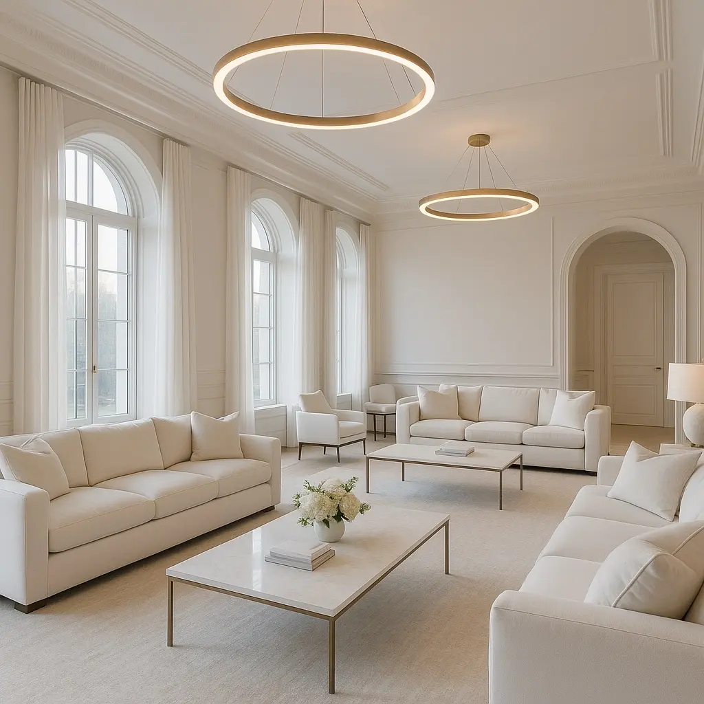 صالة بلون أبيض نقي، بتصميم هادئ وكنبات مريحة، تضفي لمسة راقية على منزلك. تكتمل بطاولات فاخرة وديكور يعبّر عن الذوق الرفيع.